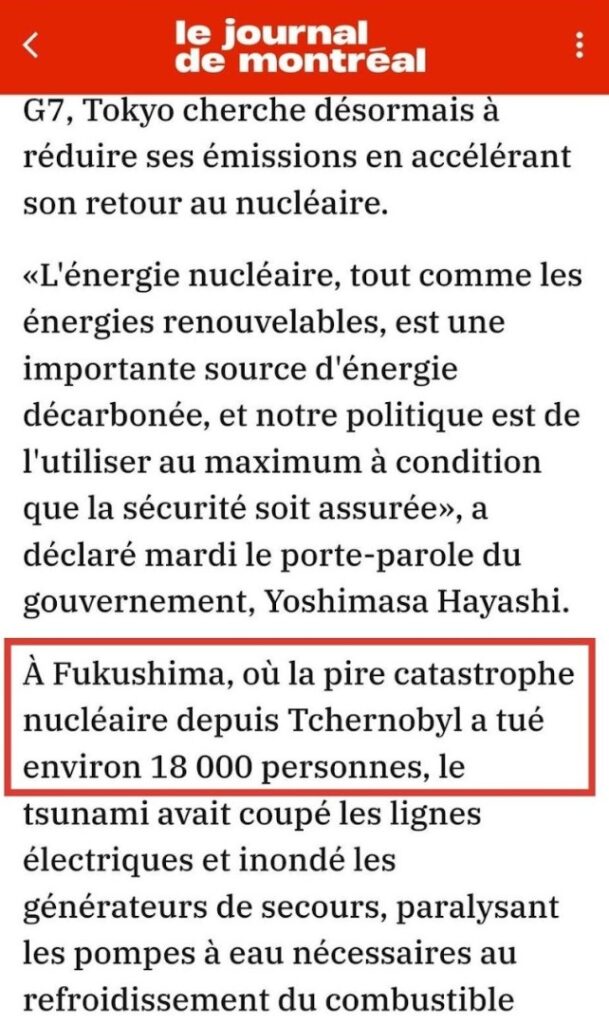 Illustration : Article du média « Le Journal de Montréal », supprimé depuis, reprenant une dépêche AFP du 29 octobre 2024 faisant un amalgame entre les victimes du tsunami et l’accident nucléaire de Fukushima. Cette dépêche largement critiquée à sa sortie avait notamment fait l’objet d’une saisine du Conseil de Déontologie Journalistique et de Médiation (CDJM).