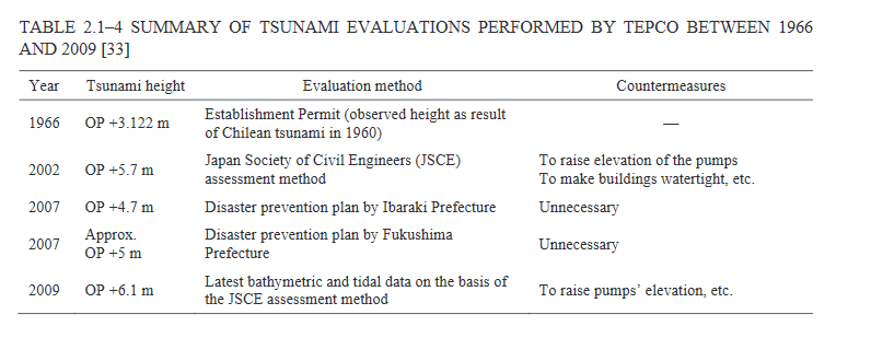 La première donne une évaluation du niveau d’eau maximum à 5,7 mètres et la seconde en 2009 de 6,1 mètres. Cette valeur est alors retenue par TEPCO et des travaux de surélévation (notamment de la station de pompage) sont effectués.